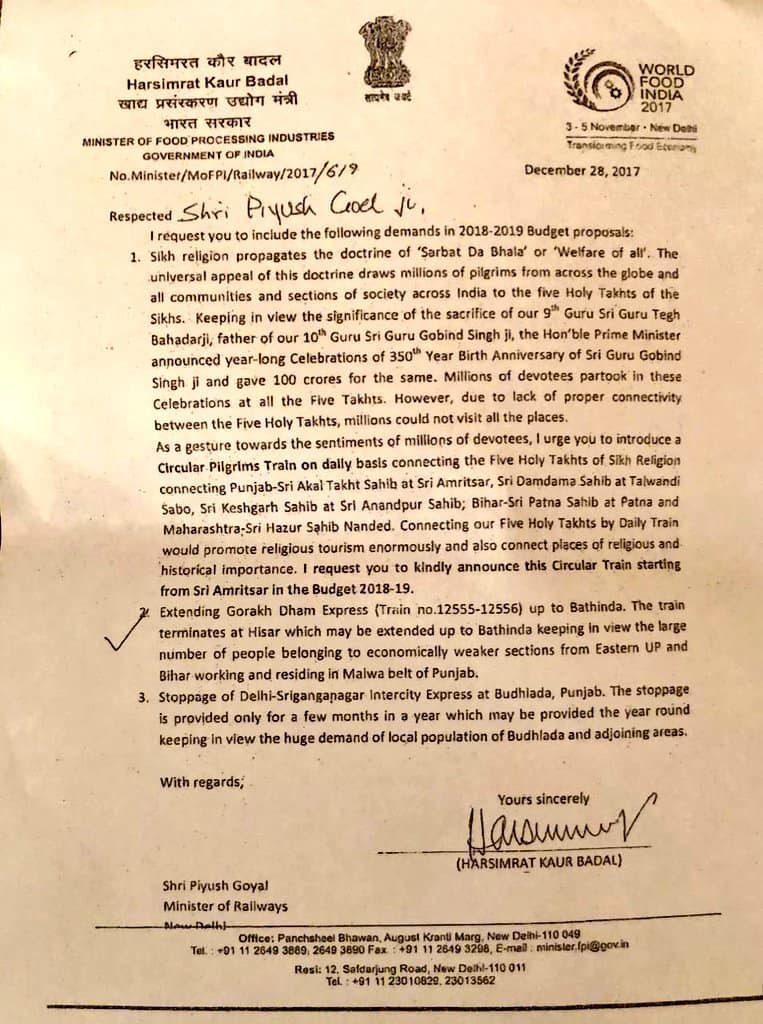 ਸਾਬਕਾ ਕੇਂਦਰੀ ਮੰਤਰੀ ਹਰਸਿਮਰਤ ਕੌਰ ਬਾਦਲ ਨੇ ਕਿਹਾ ਕਿ ਉਨ੍ਹਾਂ ਨੇ ਰੇਲ ਮੰਤਰੀ ਪਿਊਸ਼ ਗੋਇਲ ਨੂੰ ਪੰਜ ਤਖ਼ਤ ਸਾਹਿਬਾਨ ਨੂੰ ਜੋੜਨ ਲਈ ਰੇਲ ਗੱਡੀ ਚਲਾਉਣ ਲਈ ਪੱਤਰ ਲਿਖਿਆ ਸੀ। ਹੁਣ ਕੇਂਦਰ ਸਰਕਾਰ ਵੱਲੋਂ ਤਖ਼ਤ ਸ੍ਰੀ ਹਰਿਮੰਦਰ ਸਾਹਿਬ, ਤਖ਼ਤ ਸ੍ਰੀ ਪਟਨਾ ਸਾਹਿਬ, ਤਖ਼ਤ ਸ੍ਰੀ ਹਜ਼ੂਰ ਸਾਹਿਬ ਅਤੇ ਤਖ਼ਤ ਸ੍ਰੀ ਦਮਦਮਾ ਸਾਹਿਬ ਤਲਵੰਡੀ ਸਾਬੋ ਲਈ ਵਿਸ਼ੇਸ਼ ਰੇਲ ਗੱਡੀਆਂ ਚਲਾਈਆਂ ਜਾ ਰਹੀਆਂ ਹਨ। ਉਸ ਨੇ ਕਿਹਾ ਕਿ ਉਹ ਇਸ ਲਈ ਪ੍ਰਮਾਤਮਾ ਦਾ ਸ਼ੁਕਰਗੁਜ਼ਾਰ ਹੈ ਅਤੇ ਸੰਗਤ ਨੂੰ ਇਸ ਵਿਸ਼ੇਸ਼ ਰੇਲਗੱਡੀ ਦਾ ਵੱਧ ਤੋਂ ਵੱਧ ਲਾਭ ਲੈਣ ਦੀ ਅਪੀਲ ਕਰਦੀ ਹੈ।