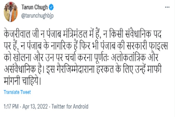 ਤਰੁਣ ਚੁੱਘ ਕੇਜਰੀਵਾਲ ‘ਤੇ ਵਿੰਨ੍ਹਿਆ ਨਿਸ਼ਾਨਾ, ਕਿਹਾ- ਪੰਜਾਬ ਦੇ ਅਫ਼ਸਰਾਂ ਨਾਲ ਬੈਠਕ ‘ਤੇ ਮੰਗਣ ਮੁਆਫ਼ੀ