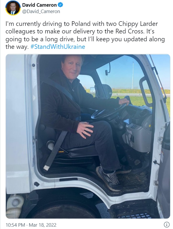 ਕੈਮਰਨ ਨੇ ਆਪਣੀ ਟਰੱਕ ਚਲਾਉਂਦੇ ਹੋਏ ਦੀ ਤਸਵੀਰ ਵੀ ਸਾਂਝੀ ਕੀਤੀ ਹੈ। ਉਨ੍ਹਾਂ ਕੈਪਸ਼ਨ ਵਿਚ ਲਿਖਿਆ ਹੈ, 'ਮੈਂ ਇਸ ਸਮੇਂ ਰੈੱਡ ਕਰਾਸ ਨੂੰ ਆਪਣੀ ਡਿਲੀਵਰੀ ਕਰਨ ਲਈ ਦੋ ਚਿਪੀ ਲਾਰਡਰ ਸਾਥੀਆਂ ਨਾਲ ਪੋਲੈਂਡ ਜਾ ਰਿਹਾ ਹਾਂ। ਇਹ ਇਕ ਲੌਂਗ ਡਰਾਈਵ ਹੋਣ ਵਾਲੀ ਹੈ, ਮੈਂ ਤੁਹਾਨੂੰ ਰਸਤੇ ਵਿਚ ਅਪਡੇਟ ਦਿੰਦਾ ਜਾਵਾਂਗਾ।