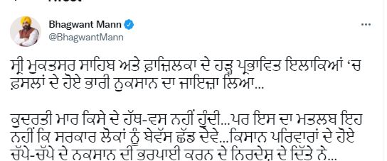 ਨਿਊਜ਼ ਡੈਸਕ : CM Bhagwant Mann ਨੇ ਅੱਜ ਸ੍ਰੀ ਮੁਕਤਸਰ ਸਾਹਿਬ ਤੇ ਫਾਜ਼ਿਲਕਾ ਦੇ ਹੜ੍ਹਾਂ ਤੋਂ ਪ੍ਰਭਾਵਿਤ ਹੋਈਆਂ ਫਸਲਾਂ ਕਾਰਨ ਹੋਏ ਭਾਰੀ ਨੁਕਸਾਨ ਦਾ ਜਾਇਜ਼ਾ ਲਿਆ। ਇਸ ਦੌਰਾਨ ਉਨ੍ਹਾਂ ਕਿਹਾ ਕਿ ਕਿਸਾਨ ਪਰਿਵਾਰਾਂ ਦੇ ਹੋਏ ਨੁਕਸਾਨ ਦੀ ਭਰਪਾਈ ਸਰਕਾਰ ਵੱਲੋਂ ਕੀਤੀ ਜਾਵੇਗੀ। CM Mann ਨੇ ਕਿਹਾ ਕਿ ਕੁਦਰਤੀ ਮਾਰ ਕਿਸੇ ਦੇ ਹੱਥ-ਵੱਸ ਨਹੀਂ ਹੁੰਦੀ ਪਰ ਇਸ ਦਾ ਮਤਲਬ ਇਹ ਨਹੀਂ ਕਿ ਸਰਕਾਰ ਲੋਕਾਂ ਨੂੰ ਬੇਵੱਸ ਛੱਡ ਦੇਵੇ।