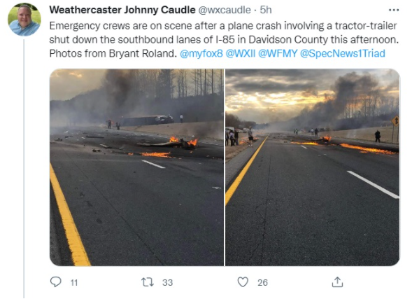 ਨਿਊਜ਼ ਡੈਸਕ (ਜਸਕਮਲ) : ਅਮਰੀਕਾ ਵਿਚ ਉੱਤਰੀ ਕੈਰੋਲੀਨਾ ਦੇ ਹਾਈਵੇਅ ਉੱਤੇ ਬੁੱਧਵਾਰ ਨੂੰ ਇਕ ਜਹਾਜ਼ ਹਾਦਸਾਗ੍ਰਸਤ ਹੋ ਕੇ ਇਕ ਟਰੈਕਟਰ-ਟ੍ਰੇਲਰ 'ਤੇ ਡਿੱਗ ਗਿਆ, ਜਿਸ ਵਿਚ ਪਾਇਲਟ ਦੀ ਮੌਤ ਹੋ ਗਈ। ਫੈਡਰਲ ਐਵੀਏਸ਼ਨ ਐਡਮਿਨਿਸਟ੍ਰੇਸ਼ਨ (FAA) ਨੇ ਦੱਸਿਆ ਕਿ 2 ਇੰਜਣਾਂ ਵਾਲਾ ਜਹਾਜ ਬੀਚਕ੍ਰਾਫਟ ਬੈਰਨ ਸ਼ਾਮ 5:35 ਵਜੇ ਲੈਕਸਿੰਗਟਨ ਵਿਚ ਡੇਵਿਡਸਨ ਕਾਉਂਟੀ ਹਵਾਈ ਅੱਡੇ ਨੇੜੇ ਹਾਦਸਾਗ੍ਰਸਤ ਹੋ ਕੇ ਅੰਤਰਰਾਜੀ 85 ਦੱਖਣੀ ਹਾਈਵੇਅ 'ਤੇ ਇਕ ਟਰੈਕਟਰ ਟਰੇਲਰ ਨਾਲ ਟਕਰਾ ਗਿਆ।